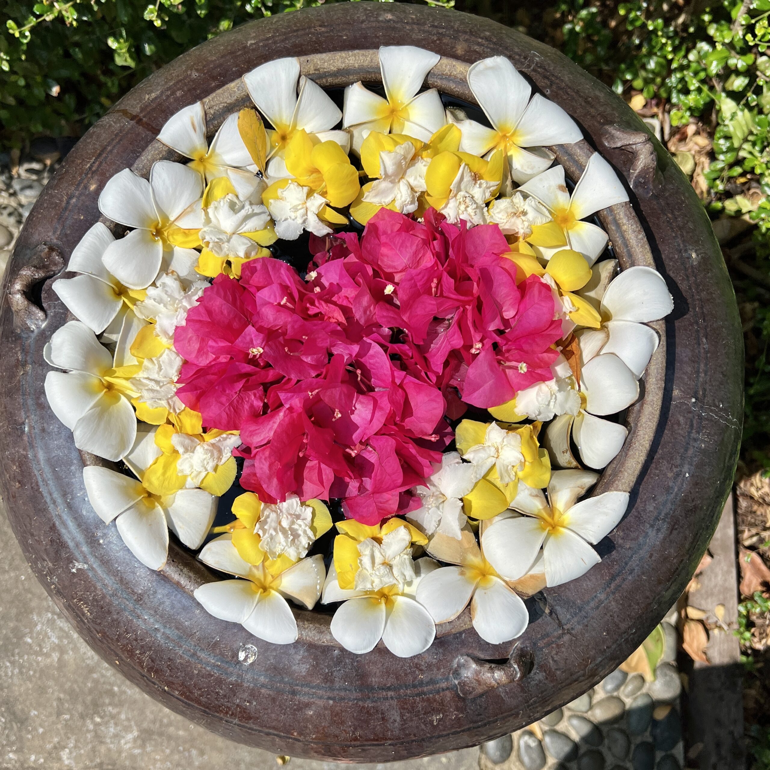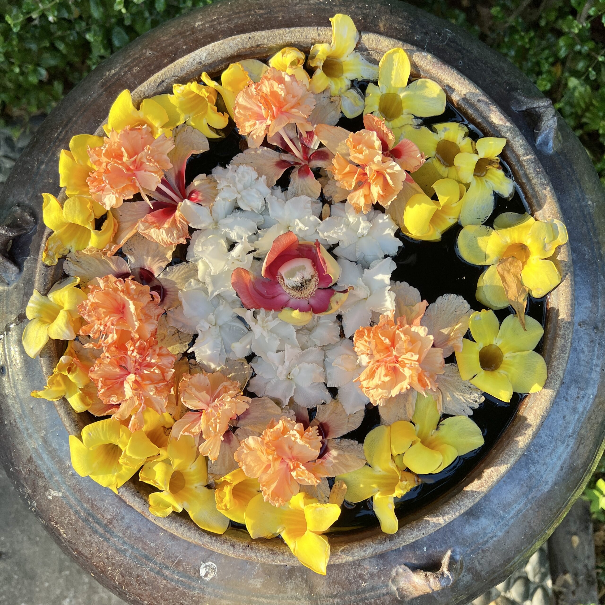 An vielen Wegkreuzungen in der Hotelanlage stehen grosse, wassergefüllte Töpfe, in denen die schönsten Blütenarrangements schwimmen, die zum Teil täglich frisch angerichtet werden.