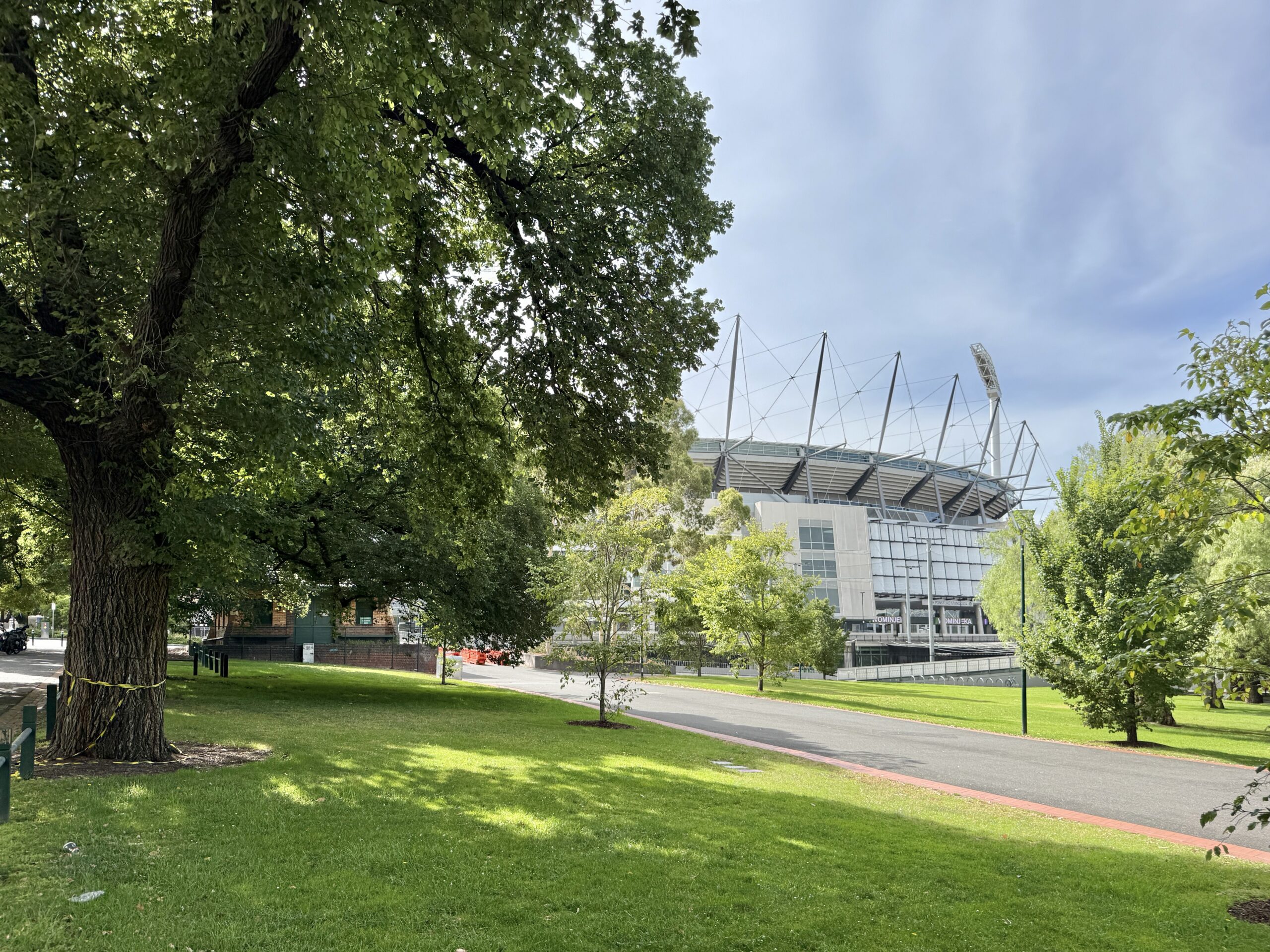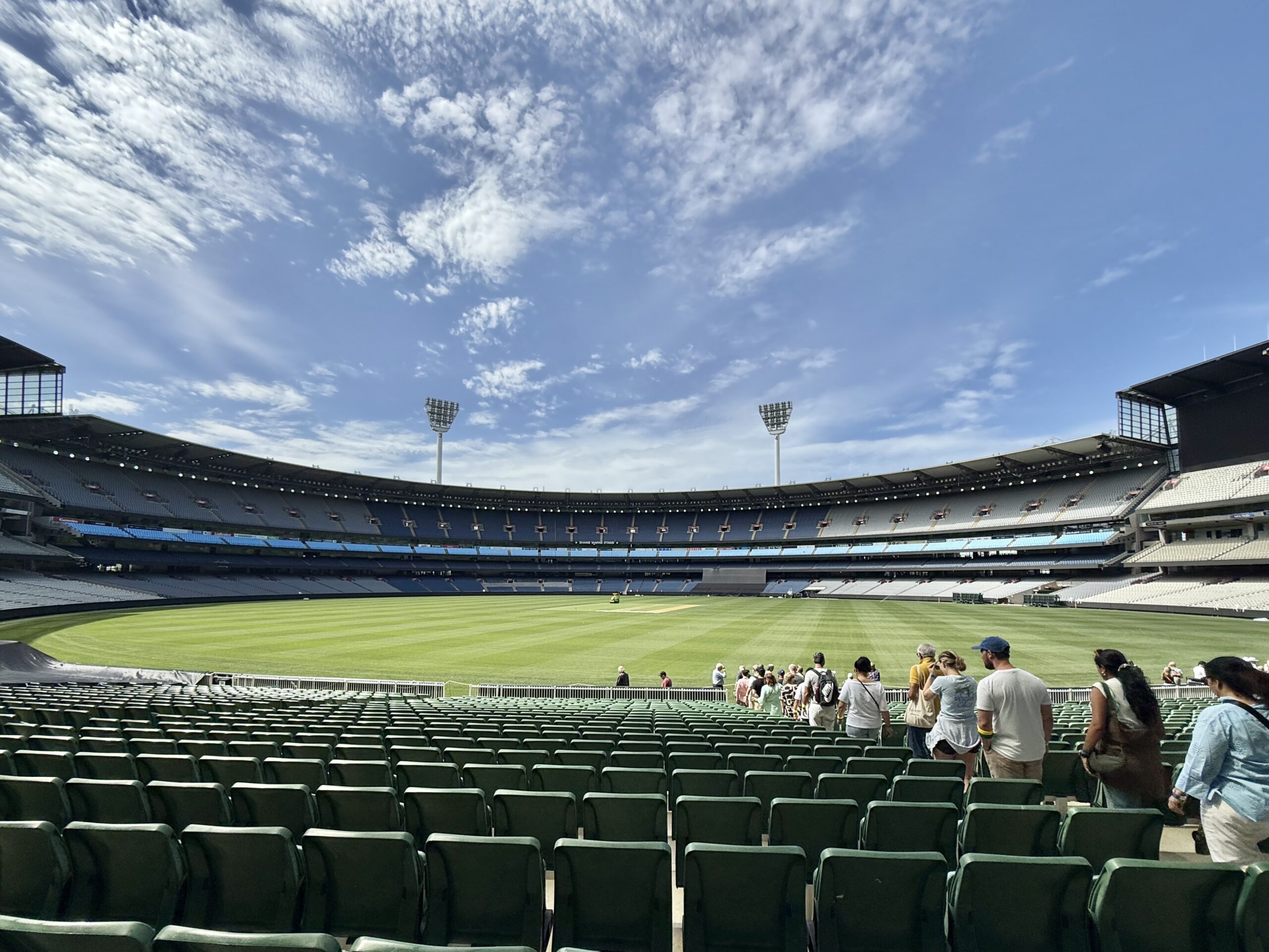 Heute haben wir eine Tour im MCG (Melbourne Cricket Ground) gebucht. Mit dem Tram der City Circle Line fahren wir so weit es geht, die letzte Viertelstunden gehen wir zu Fuss. Im Zentrum ist das Tramfahren gratis, weiter draussen kostet es. Es ist allerdings nur mit einer Android-prepaid-Karte möglich, was das Vorwärtskommen in der Stadt kompliziert macht. Das riesige Stadion (100024 Plätze) wird für Cricket, “Aussie”-football, weitere Sportarten und Leichtathletik genutzt. Die Führungen machen Senioren-members des Melbourne Cricket Clubs. Es braucht gute connections und viele Jahre Geduld um überhaupt member zu werden. Carole führte uns zackig durchs Stadion und wusste viele Anekdoten zu erzählen. Zu Fuss gingen wir zurück ins Zentrum und landeten im Chin Chin-Restaurant, wo wir ein Classic-sharing-menu bestellten. Nach sechs Tellern hatten wir eigentlich genug, aber dann kamen die Hauptgerichte. Zum Abschluss wurde uns ein special dessert serviert, anlässlich des Geburtstags. Dummerweise hatten sie uns mit einem anderen Paar verwechselt! Unsere celebration galt dann drei Tage Australien. Zurück im Appartement mussten wir erstmals waschen und erstmals selber eine Mahlzeit zubereiten. Jedes Mal wenn ich auf den Balkon trete, staune ich, dass all die Hochhäuser noch da sind, und zu jeder Tageszeit anders aussehen. Wunderbar!
