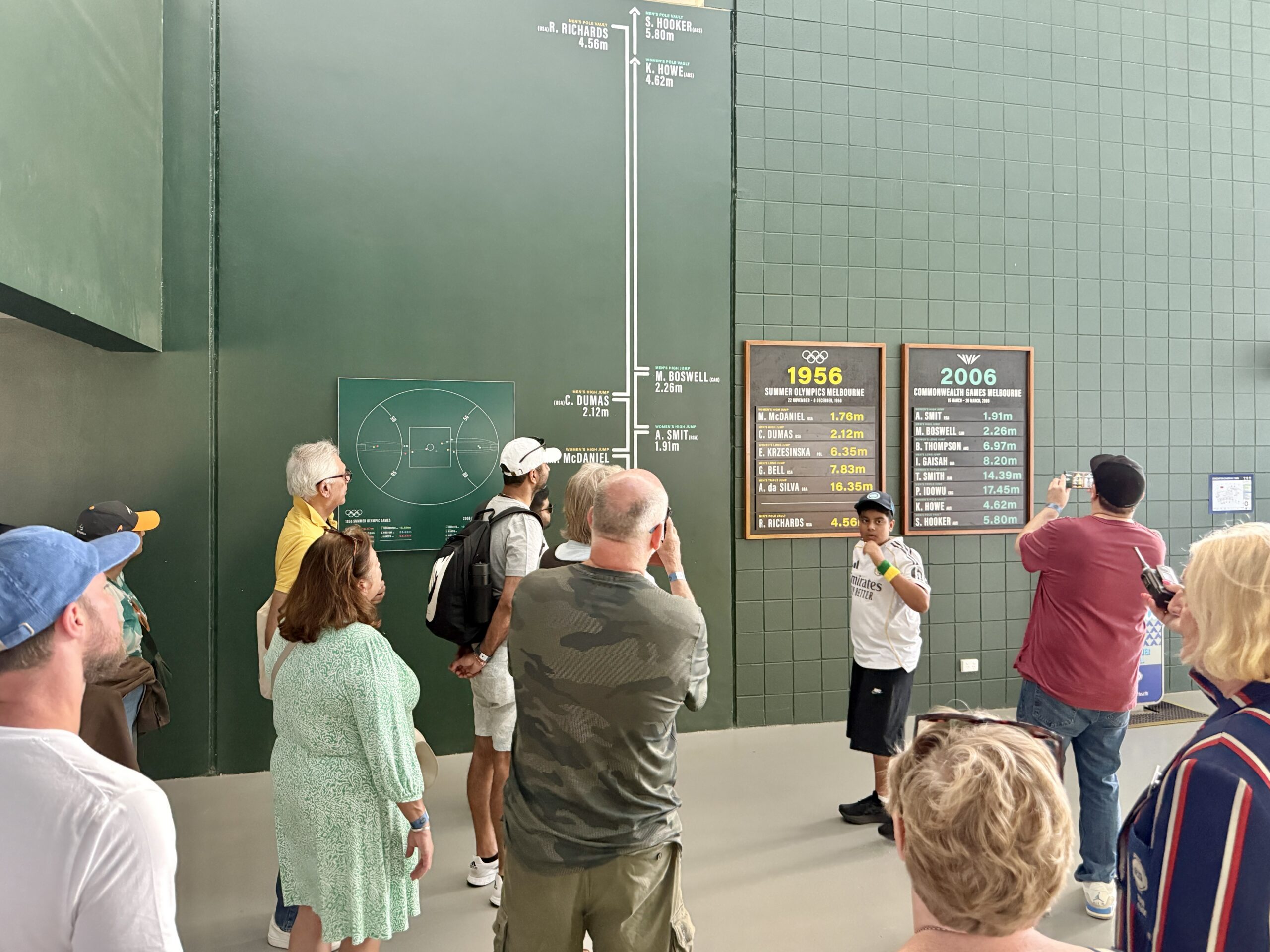Kunst-Installation auf bricks und behauenen SteinenJolimont-Quartier, ältere Häuser und moderne WohneinheitenMCG (Melbourne Cricket Ground)Auf dem Bildschirm und nebenan findet das Tennis Australian Open stattDick Reynold-Statue (ein legendärer "Aussie"-football-player)Hier beginnt die Tour durch den MCGRiesiges FeldSuper Rasen. Von sechs caretakern täglich gepflegt.Im Media-Raum des MCG. Eine der zwei identischen GarderobenNach der Saison (also jetzt) wird alles ausgeräumtDie Football-Spieler steigen in kalte Bäder um Krämpfe und Muskelkater zu vermeiden.Blick vom vierten Stock auf das SpielfeldDie grünen Sitze sind den member vorbehalten. Aber auch sie müssen sich für ein Ticket bewerben. Je wichtiger das Spiel umso mehr member möchten dabei sein. Je länger jemand Mitglied ist, umso eher erhält er einen Platz.Der rote Sitzplatz im hellblauben Bereich (unter dem rechten Flutlicht) gehört Simon O'Donnell, der den Ball 1993 hierhin schlug.Zweimal wurden hier auch olympische Spiele ausgetragen. Auf den Tafeln werden Resultate von 1956 und 2006 verglichenEin weitere Cricket-Held von kleiner Statur und besonders kleinen FüssenBlick von den Tribünen der member des Melbourne Cricket ClubsZum 150-jährigen Jubiläum wurde dieser Teppich (2 x 7 Meter) geknüpftBlick über die Gleisezum CBD (Central Business District)Nebenan findet das Australian Open statt. Heute ist Frauen-Tag.CBD mit den Bauten des Federation Square im VordergrundForum MelbourneChin Chin RestaurantCorn Fritters, Port Roll-ups, Kingfish sashimiWagyu Beef & Riec noodles, Barramundi & Green apple-Salatstir-fried eggplant, butter-chicken curryChocolate-coco-pannacottaEingang zum Regent TheatreEin Seiteneingang zum Intercontinental MelbourneHochhäuser on Spencer StreetKochen mit beschränkten Zutaten: Huhn, Salat, Apfel, Essig, Öl, Sojasauce, Salz, PfefferPouletsalatAbend über dem Yarra RiverJedes Mal eine Freude, dass die Hochhäuser noch da sind!
