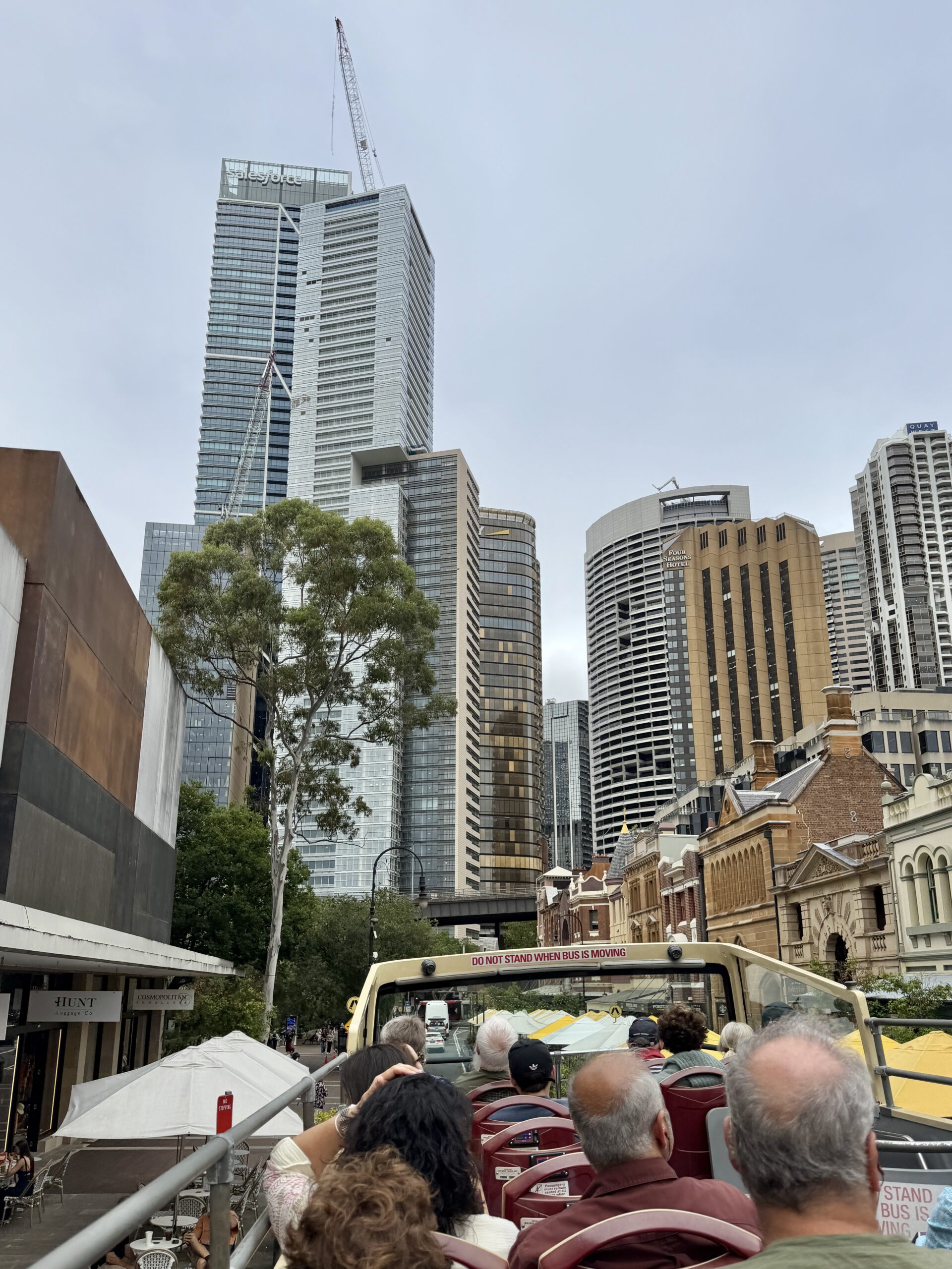 Es ist feuchtwarm und bedeckt als wir auf die Hop-on-hop-off-Bustour gehen. Nach kurzer Zeit fängt es auch an zu nieseln. Dieser Niederschlag zieht wie eine sehr feuchter Nebelwolke durch die Stadt und man sieht ihn von Weitem wie ein Vorhang heranwehen. Am neuen Fish Market steigen wir aus und gehen durch die Markthalle. Sehr viel Fisch und Meergetier wird zum direkten Verzehr angeboten. Überall sitzen Leute an Tischen, auf Bänken und Treppen und essen aus Kartonschachteln. Im Restaurant Lua (by Luke Nguyen) geniessen wir einen wunderbaren Lunch. Am Abend treffen wir Margareth und Oliver zu einen Drink und einem Spaziergang im Botanischen Garten. Zum Znacht im Restaurant Malayah kommt auch noch David, der hier in Sydney lebt und bei dem unser Auto für eine Woche stehen kann, dazu.
