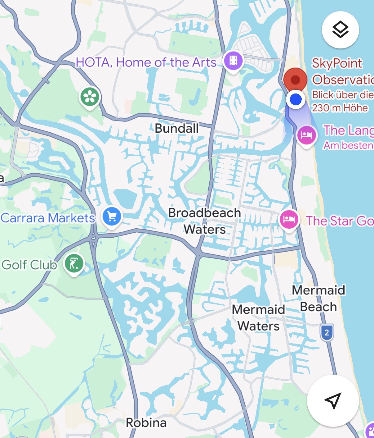 Frühstück in tropischer UmgebungThe Crest, hier haben wir gewohntLawson Street, die Hauptstrasse in Byron ByKoalagebiet (wir haben immer noch keinen gesehen)Violette PrachtGrün, grün, grünAuf einem Tourist Drive im Hinterland von Byron BayViel Landwirtschaft: Rinder, Obst, Gemüse …… und Zuckerrohr.Ein Halt am Strassenrand, 20 Meter durch Eukalyptus und Banksien …… und schon ist man am StrandWieder einmal ein Regenschauer im AnzugKleines Krebschen (2 cm) im weissen superfeinen SandInsel für Flüchtlinge?Nein, eine einfache Verkehrsinseln (hier haben Fussgänger keinen Vortritt)Baywatch in KingscliffStrand überwacht, Schwimmen ist ok zwischen den gelbroten FahnenKaffeepause nach dem MorgenspaziergangGrosse Verwirrung: Es ist 12.19 Uhr, wir sollen noch 36 Minuten fahren um um 11.55 Uhr anzukommen? Wir sind in im Bundesstaat Queensland angekommen und hier gibt es keine Sommerzeit (dafür wird es früh dunkel).Die Gold Coast erinnert an Florida, nicht nur mit dem Namen der Orte, …… und auch ein bisschen an Hurden am Zürisee.Hier wir eine neue Tramlinie gebaut. (Brisbane ist Austragungsort der Olympischen Sommerspiele 2032)In der Mitte steht der Q1-Tower mit dem Sky Point im 77. StockHier muss man den Kopf fest in den Nacken legenBlick nach Osten auf den PazifikBlick nach Norden (Richtung Brisbane)Blick nach Osten und …… auf eine Baustelle mit Holcim-BetonmischernBlick nach SüdenLunch with a viewNochmals ein Blick auf die Wasserwege ….… die man auf Google Maps sehr schon sieht (Screenshot)Städtischer VerkehrBlick auf die Skyline von Brisbane (wir wissen noch nicht, dass wir im Turm rechts logieren werden)Lobby zum Uoptown-Teil des Skytowers (bis zum Pool auf der 40sten Etage)BegrüssungBlick ins ApartmentKüche mit sehr guter AusrüstungSchlafzimmerBlaue StundenSalade Liègeoise mit Wurstresten statt SpeckBrisbane by night 😍