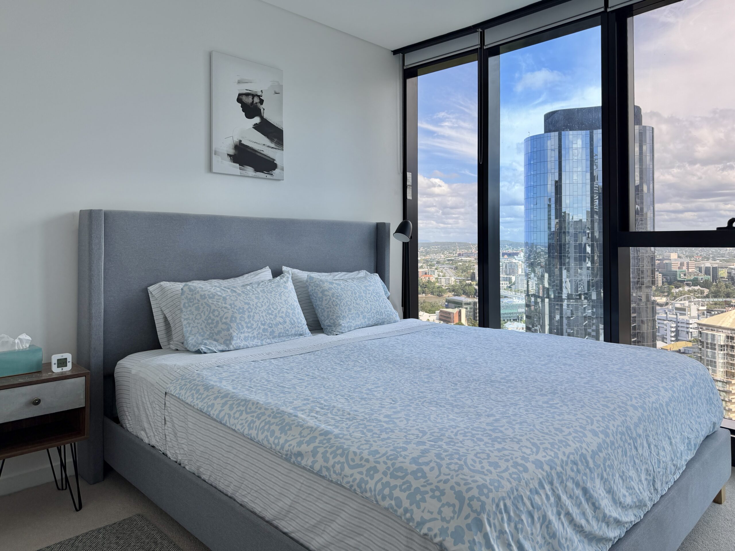 Heute haben wir nur etwa 175 km zu fahren, aber wir möchten möglichst nahe an der Küste bleiben. Das stellt sich allerdings als illusorisch heraus, weil zwischen Meer und Strand und der Strasse immer ein Stück Wald liegt. Als wir etwa zur Mittagszeit an der Gold Coast ankommen, finde ich auf Google Maps den Q1-Tower (322.5 Metern, höchstes Gebäude in Australien) mit einem Bistro im 77. Stock. Von dort oben hat man eine wunderbare Aussicht in alle Richtungen und vor allem auch auf die Hochhäuser dieses Küstenabschnittes, der den sechstgrössten “urbanen Raum” in Australien bildet. Ziemlich direkt gelangen wir von der Autobahn auf die Margaret-Street 133, wo sich unser Airbnb im 38. Stock des Skytowers befindet. Es ist eine hübsche Wohnung mit einem Schlafzimmer und sie ist sehr gut und praktisch eingerichtet. Es stellt sich heraus, dass wir überhaupt nicht weit oben im Wohnturm sind, sondern dass über uns noch 52 weitere Etagen folgen. Mit 274.3 Metern ist es das höchste Gebäude in Brisbane, das vierthöchste Australiens , aber im Vergleich zum Burj Khalifa (828 m) doch eher klein.Wir richten uns ein , gehen einkaufen, trinken einen Apéro in einer Bar und essen dann “zu Hause” Znacht.